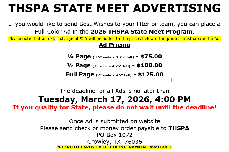 T.H.S.P.A. does not condone the practice of a lifter losing and/or gaining excess amounts of body weight. Lifter well-being and safety should be at the forefront when determining in which weight class a lifter will compete.